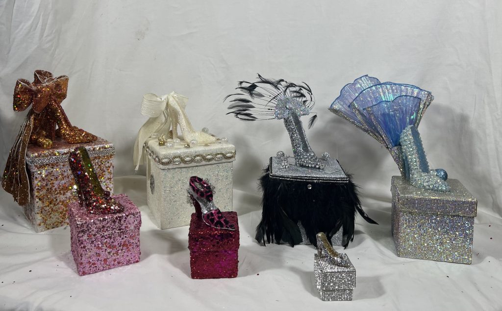 Shoeboxes vary in size from two to six inches. Both the shoebox and the shoe can be hand-beaded or decorated with glitter, allowing for customization to fit specific themes or requests. The WES can also be color-coordinated to complement special events. To ensure lasting quality, the exterior decorations are securely sealed and the interior is carefully lined for moisture protection.